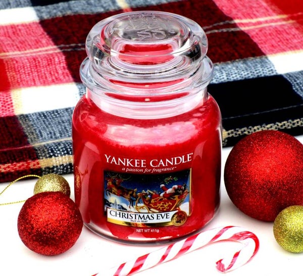 Yankee Candle - Christmas Eve: "Een traditionele kerstgeur van een warme haard, gesuikerde pruimen en gekonfijte vruchten."