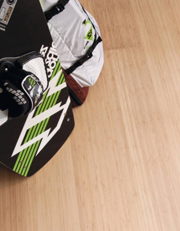 De LANCERO kreeg verticale constructie. Hierbij worden bamboestroken zijwaarts gedraaid en zo naast elkaar gelegd. Vervolgens worden ze gelijmd en samengeperst. Verticale planken hebben een meer lineaire uitstraling en een desig- nlook. Deze vloer werd licht gecarboniseerd en wit geolied.